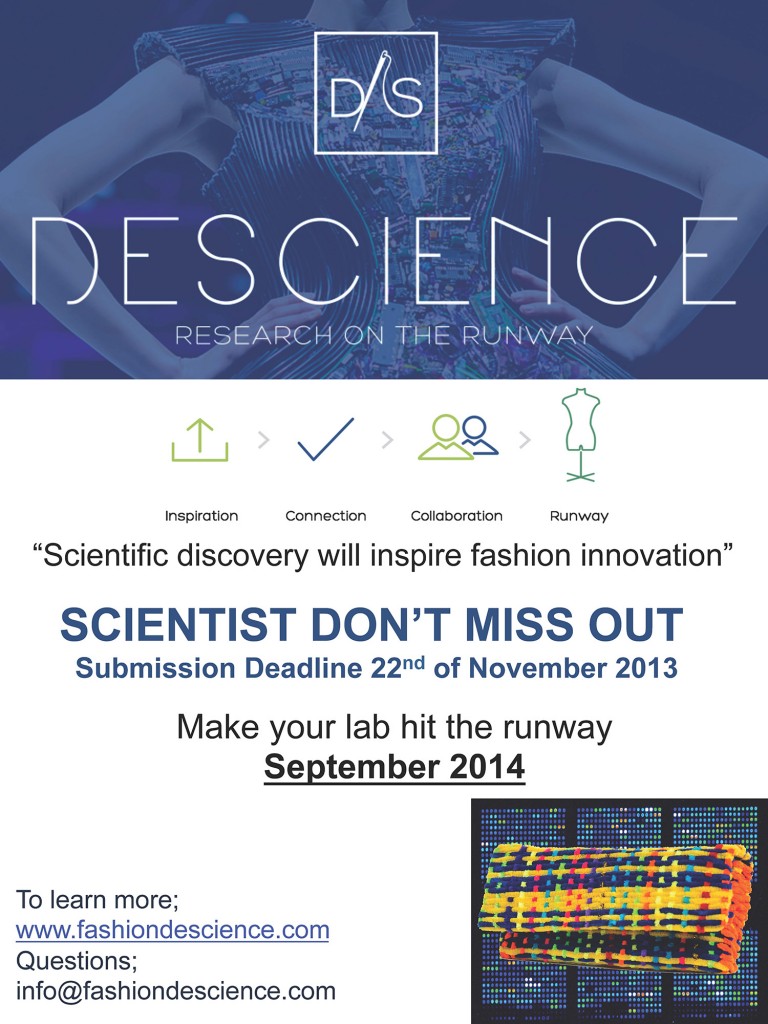 Educate the world about you research. Submit scientific images & explanation by November 22 and if your submission is chosen, you’ll be paired in January with an up-and-coming fashion designer who will create a garment inspired by your research to walk the runway 25th of September. Minimum commitment beyond initial submission is a single review session with your designer, though additional collaboration is highly encouraged.